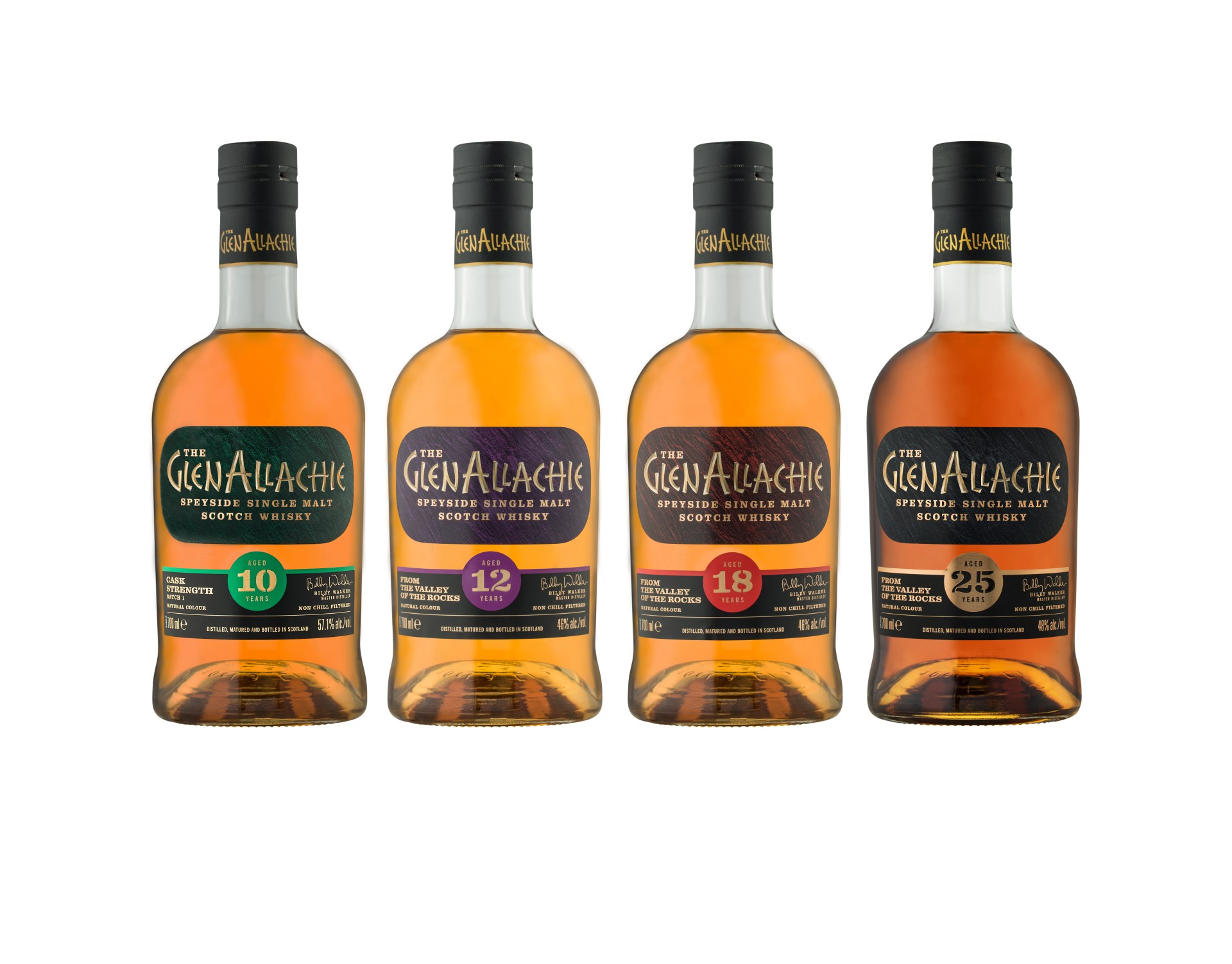 The initial GlenAllachie single malt Scotch whisky range consists of 10 year old cask strength (57.1% ABV), 12 year (46% ABV), 18 year (46% ABV) and 25 year old (48% ABV). None of the range is chill- filtered or coloured.