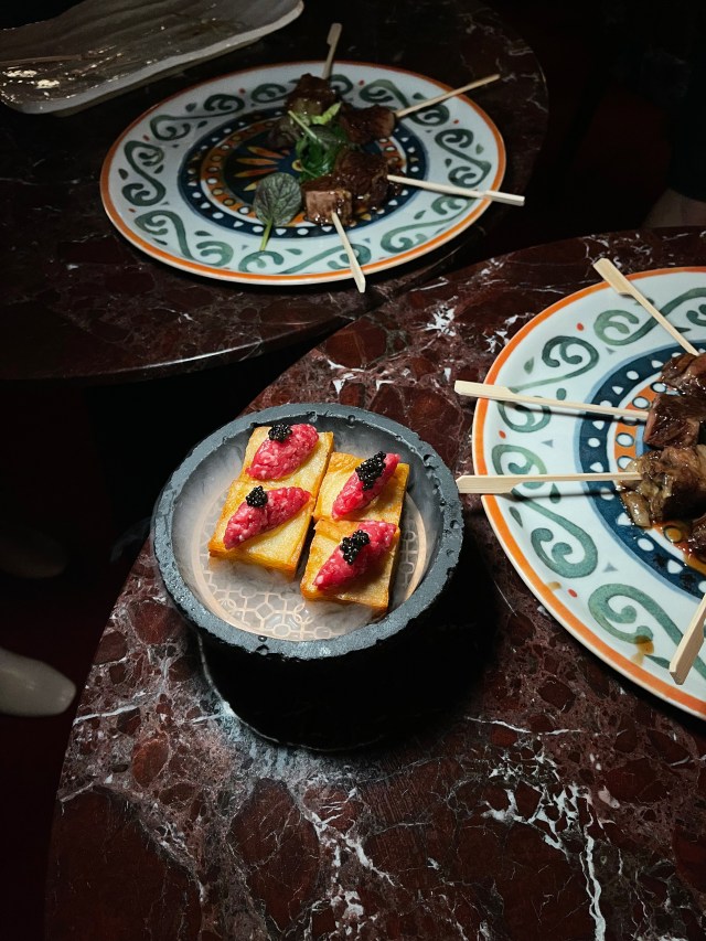 Throughout the night, live musicians performed at the front of the luxe speakeasy. As attendees tasted their own cocktails, canapes were served showcasing Cardea’s bar menu. The selection for the evening included half-moon dumplings with shiitake and king oyster mushrooms, potato mille-feuille featuring Australian wagyu crudo and caviar, eggplant bao, and black angus ranger valley short ribs.