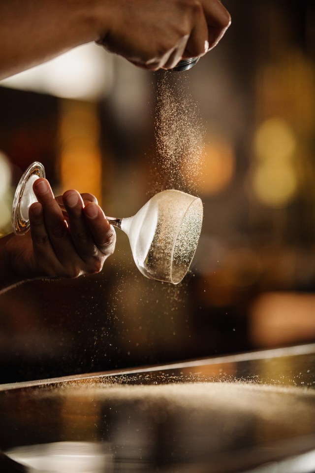 1. Prepare a chilled coupe glass, and garnish one side of the glass with a spice blend (salt, black pepper, oregano and caraway)
