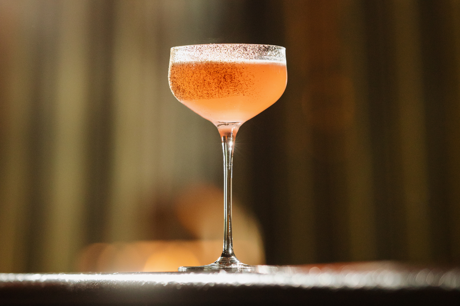 1. Prepare a chilled coupe glass, and garnish one side of the glass with a spice blend (salt, black pepper, oregano and caraway)