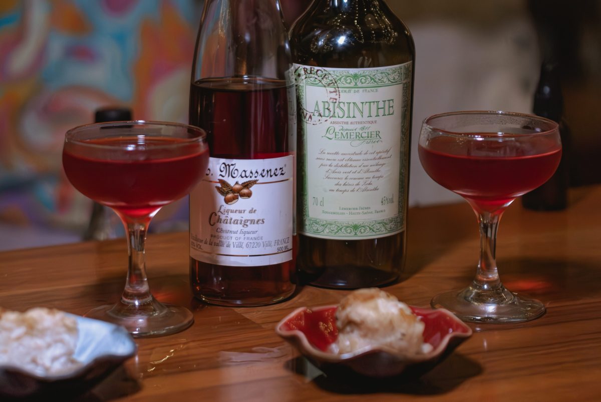 “This drink takes you straight to a French backyard during Nouveau Day: bananas, jammy dark berries, nuts, choccy and a lick of absinthe for subtle anise. Stirred down, served ice cold and sprayed with the fruity, peppery aromas of pepperberry. This kind of sits between a Hanky Panky and a nutty, creamy Gamay, somehow with a little extra texture and slight umami. Lacto fermented berries also add a little funk, which is what you get with great Beaujolais wines,” Tom described.